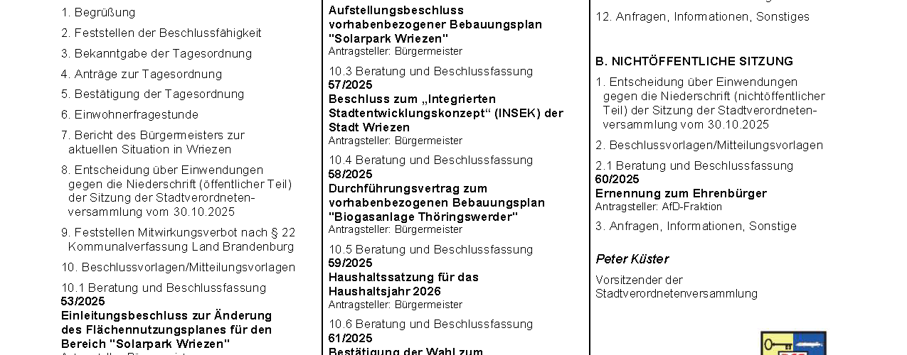 LiveStream – Sitzung d. Stadtverordnetenversammlung Wriezen / 16. Sitzung d. Legislaturperiode am 27.11.2025