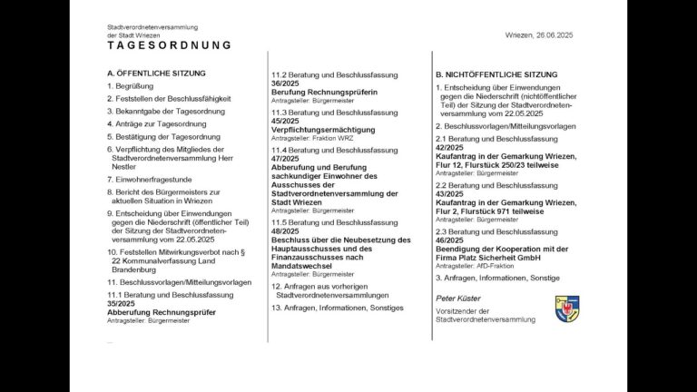 LiveStream zur 199. Sitzung d. Stadtverordnetenversammlung Wriezen / bzw. der 09. Sitzung d. aktuellen Legislaturperiode am 22.05.2025 24. Mai 2025