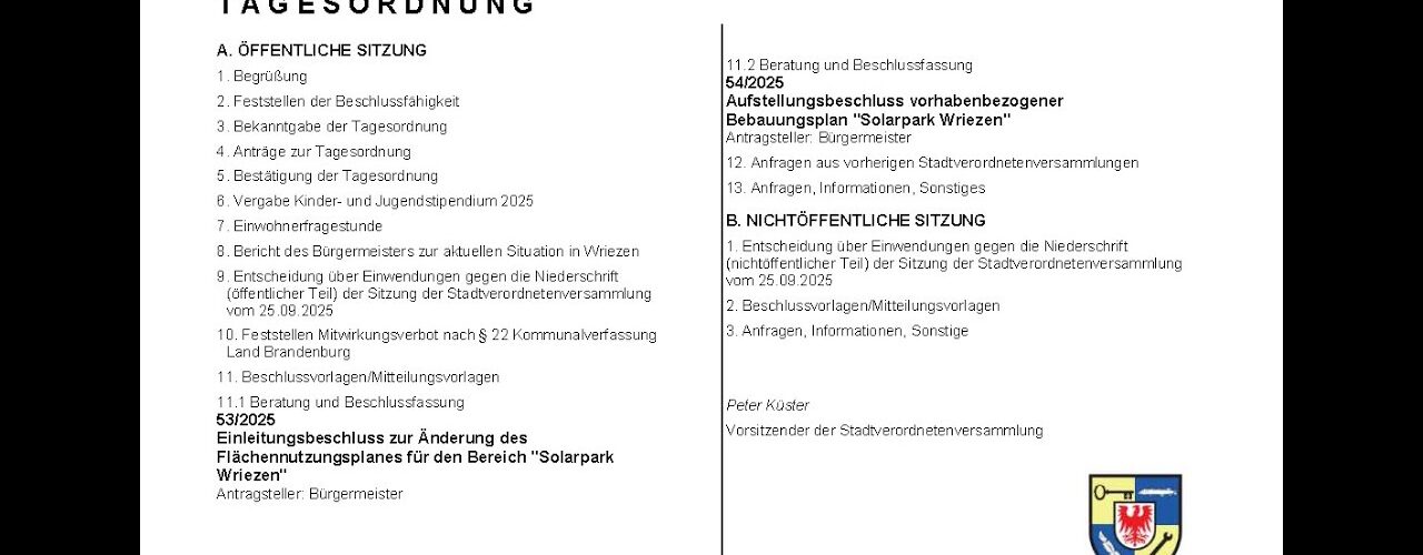 LiveStream d. Sitzung d. Stadtverordnetenversammlung Wriezen / 09. Sitzung d. Legislaturperiode vom 26.06.2025 27. Juni 2025